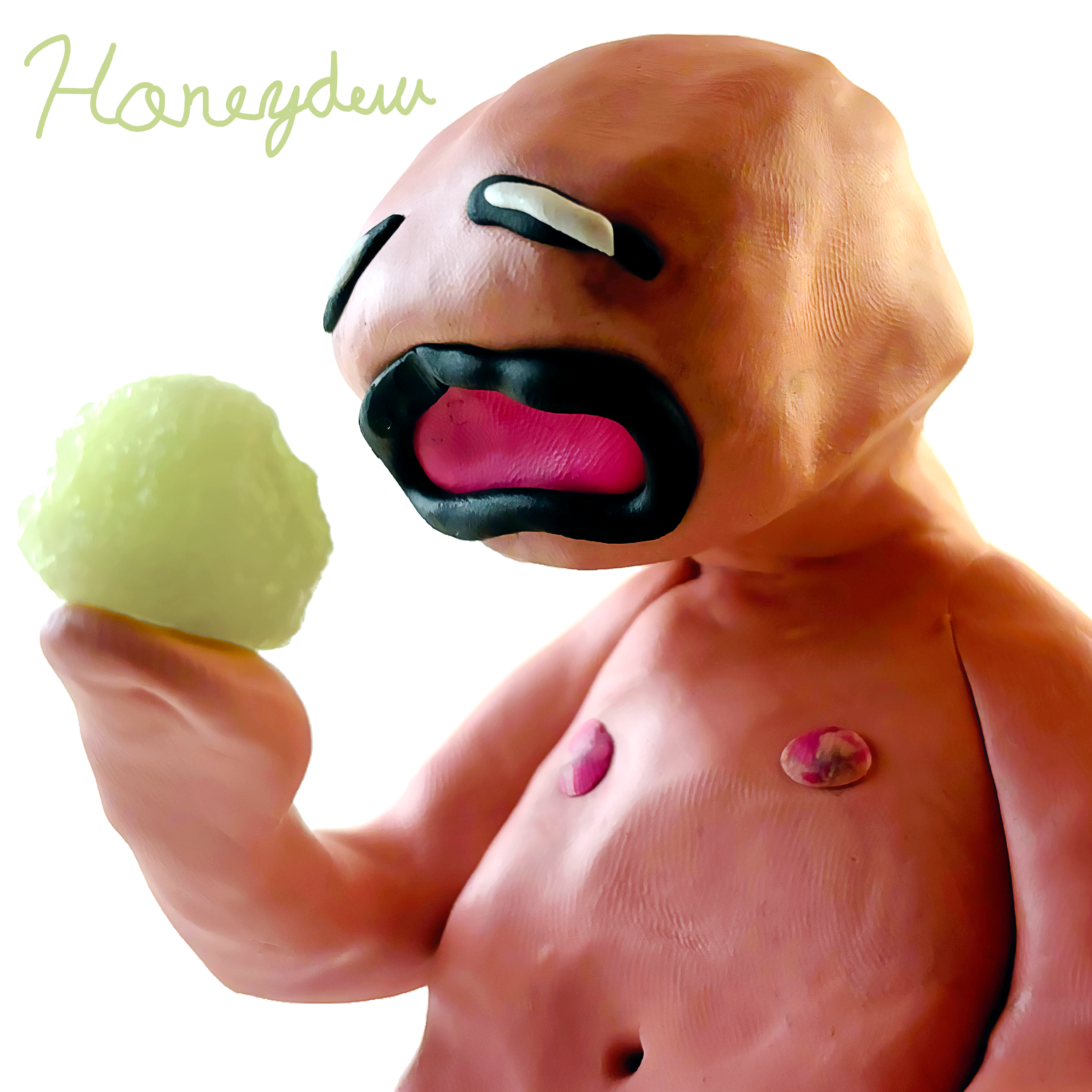 At this stage, I leaned more literally into the EP’s namesake by introducing a real piece of honeydew, held by the character like a crystal ball. The figure stares into the fruit with an eerie stillness. While the wailing facial expression remains from the previous draft, the body language is noticeably calmer, creating a tension between emotional intensity and physical restraint.