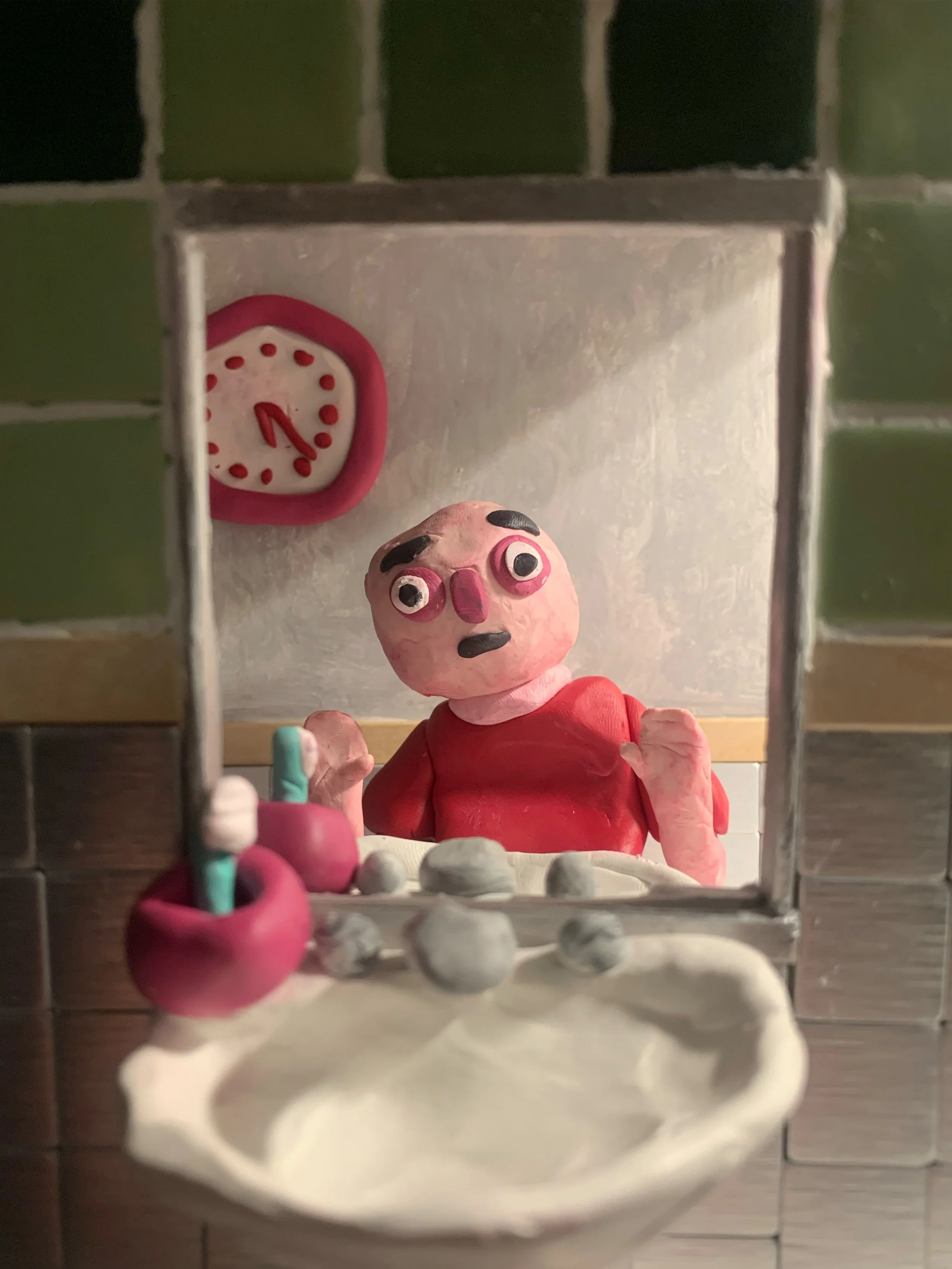 The set was constructed using foam board, ceramic and aluminum tiles, popsicle sticks, acrylic paint, and polymer clay. The element I’m most proud of is the mirrored effect. By recreating the sink and toothbrush on both sides of the set, I was able to create a convincing illusion of reflection rather than relying on digital manipulation.