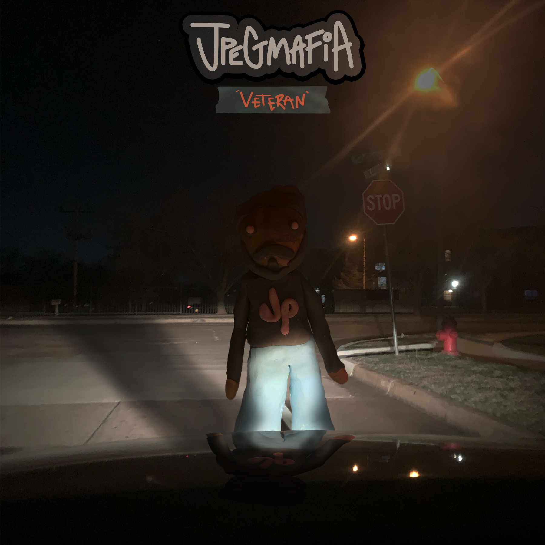 For my interpretation of JPEGMAFIA’s album cover, I created a physical clay sculpture of the artist to ground the project in a tactile, real-world process. To inform the lighting and atmosphere, I photographed myself standing in front of my car’s headlights and used that image as a reference for shadow placement and reflections in the final composition.