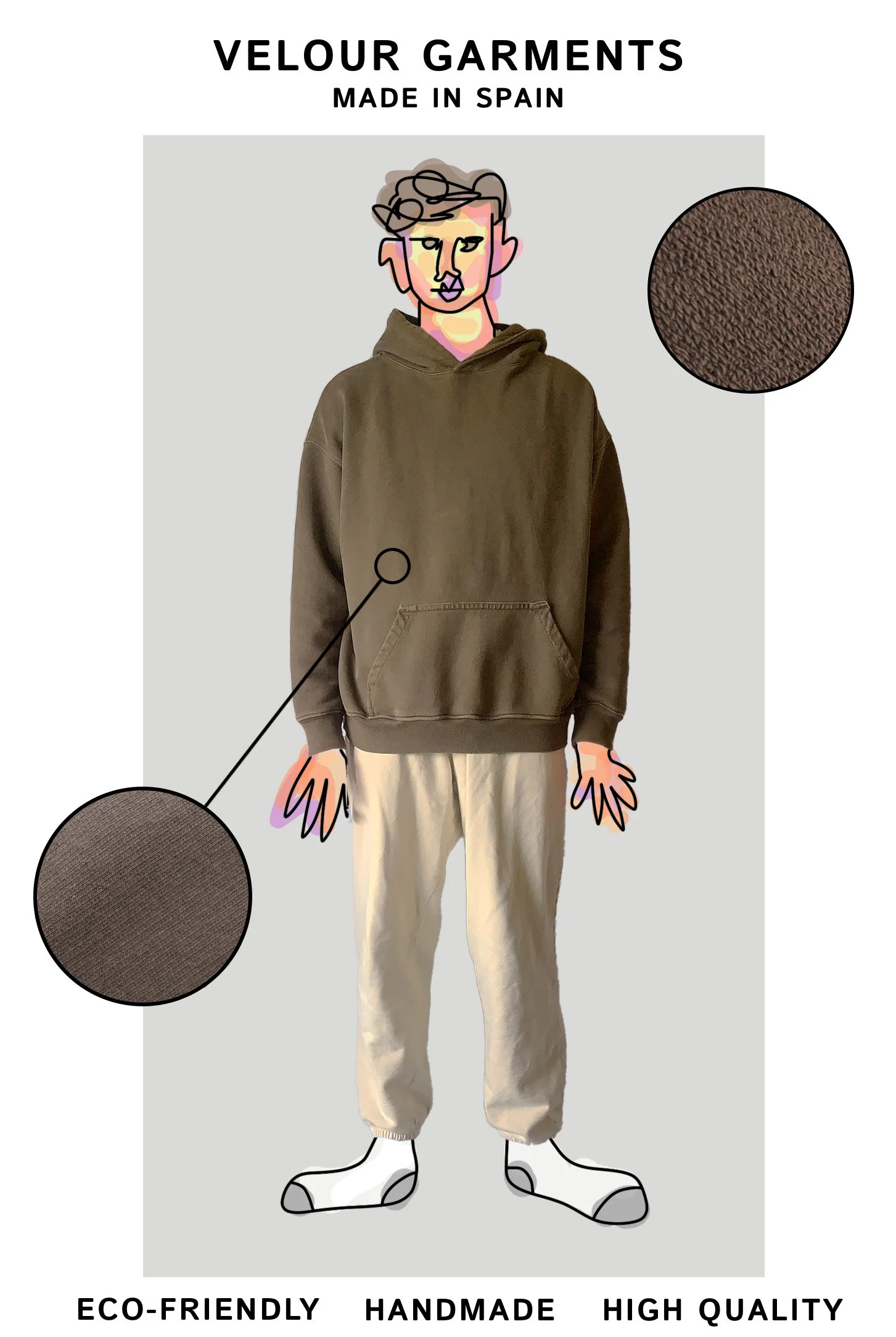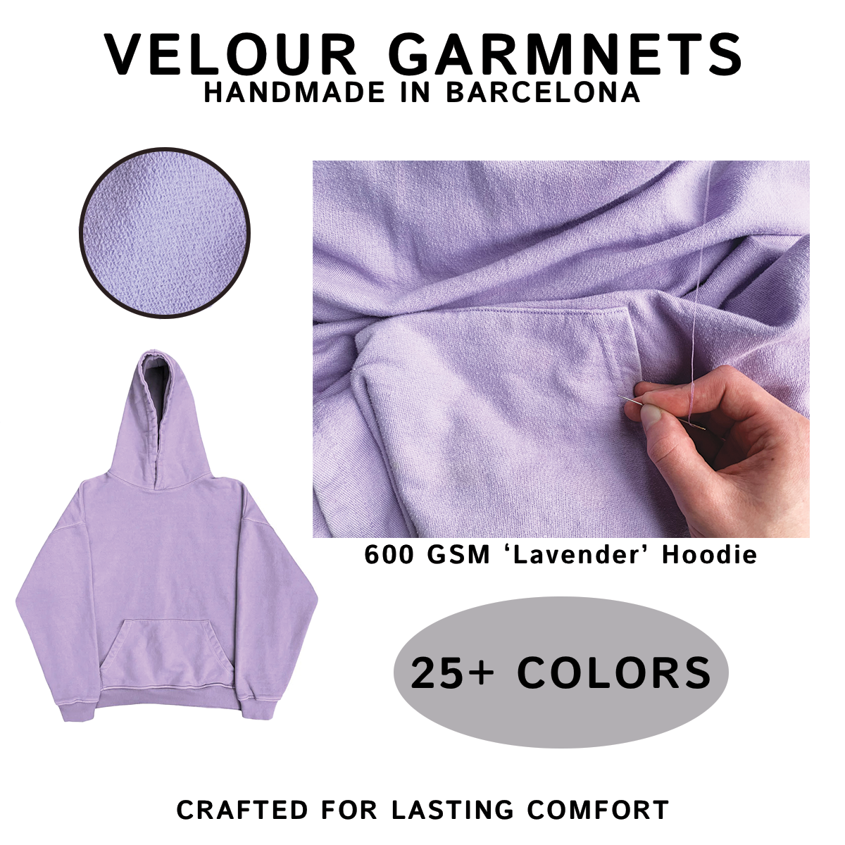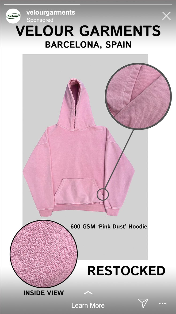 For Facebook, aesthetics took a back seat to clarity and value. With an older audience in mind, I prioritized information that reinforces trust and craftsmanship. The imagery focuses on the handmade process, showing someone sewing the hoodie, while copy highlights customization, quality, and the availability of over 25 colors. This approach positions the product as intentional, well-made, and worth investing in.