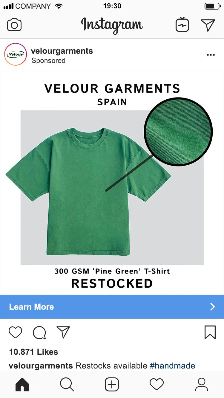 For Instagram, I shifted toward more information-forward visuals. These ads highlight fabric quality through close-up shots. They clearly communicate that the brand is based in Spain, showcase popular bright COLOR WAYS, and signal product availability. The use of the word restock suggests high demand and urgency without relying on overly sensational language, aligning with a more thoughtful, design-conscious audience.